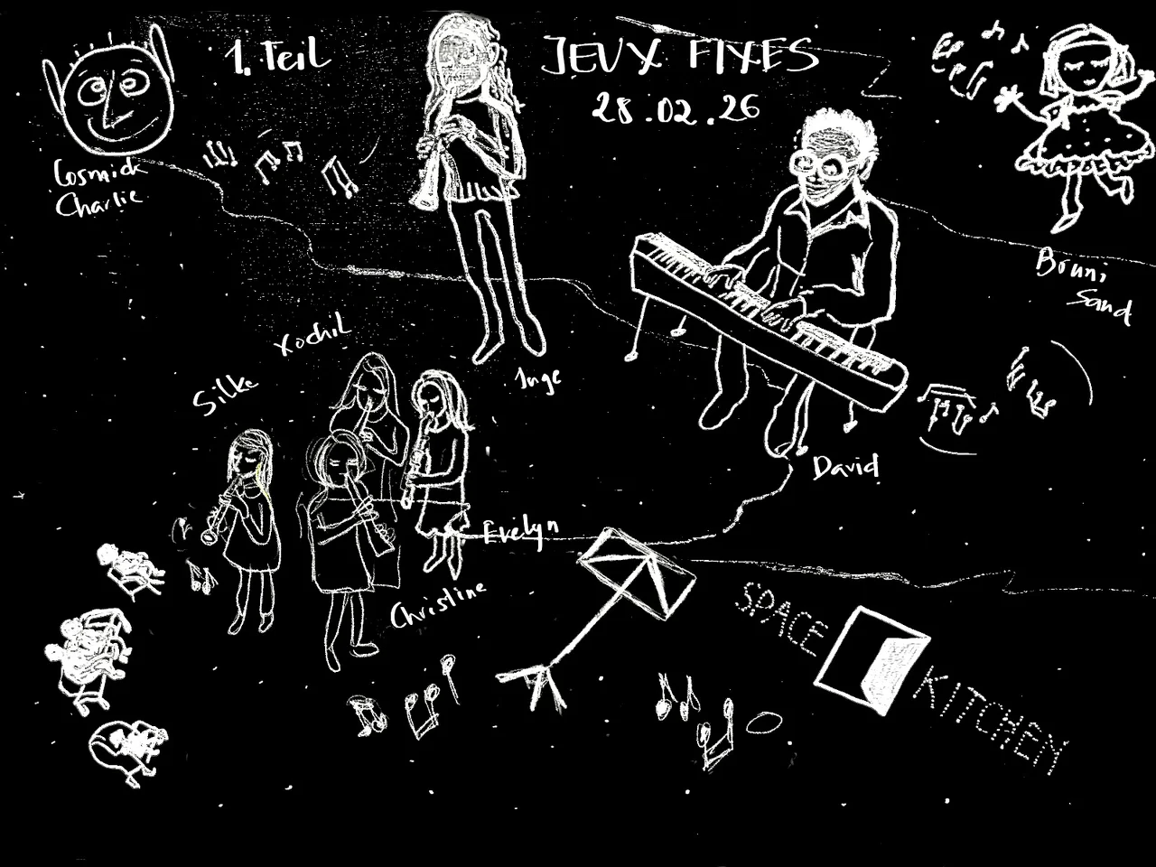 Bruni Sand beschreibt ihre Gefühle zu den Jeux fixes folgendermaßen: es ist wie damals in der Kindheit, als man fragte: „Willst du mit mir spielen?“ oder später in der Jugend, als du angesprochen wurdest: „Willst du mit mir tanzen?“ Schon in der Frage, in der Aufforderung zum gemeinsamen Spiel beginnt das Herz zu tönen. So soll es sein. Unsere Space Kitchen ist ein Ort des freien Spiels, der freien Gedanken – unsere Utility Research Kitchen (frei nach Frank Zappa).